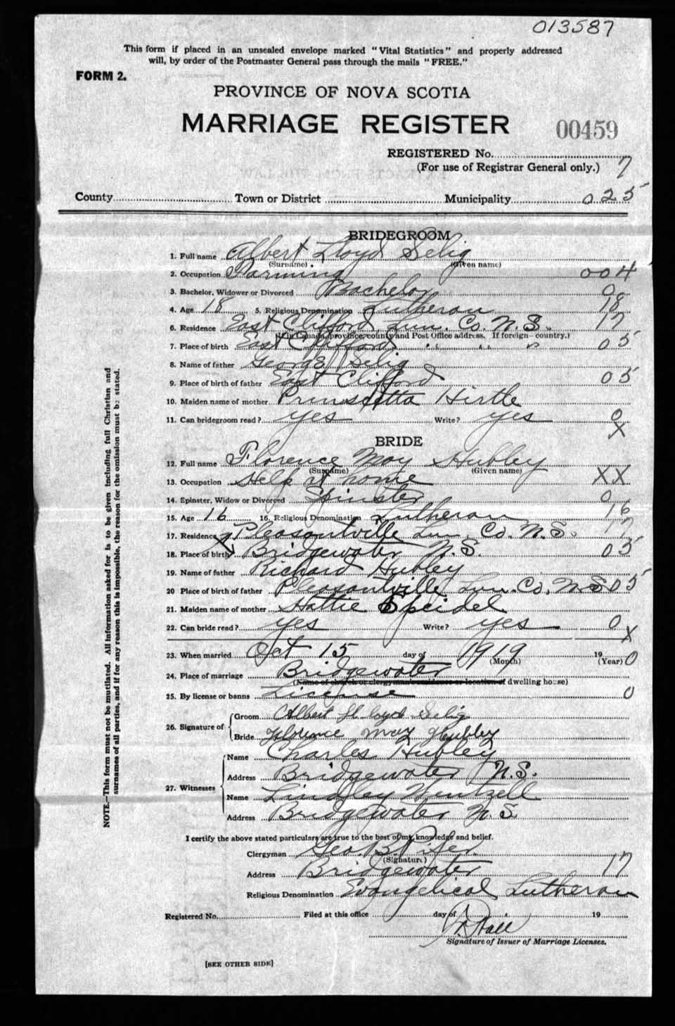Registration: Year: 1919 number: 13587