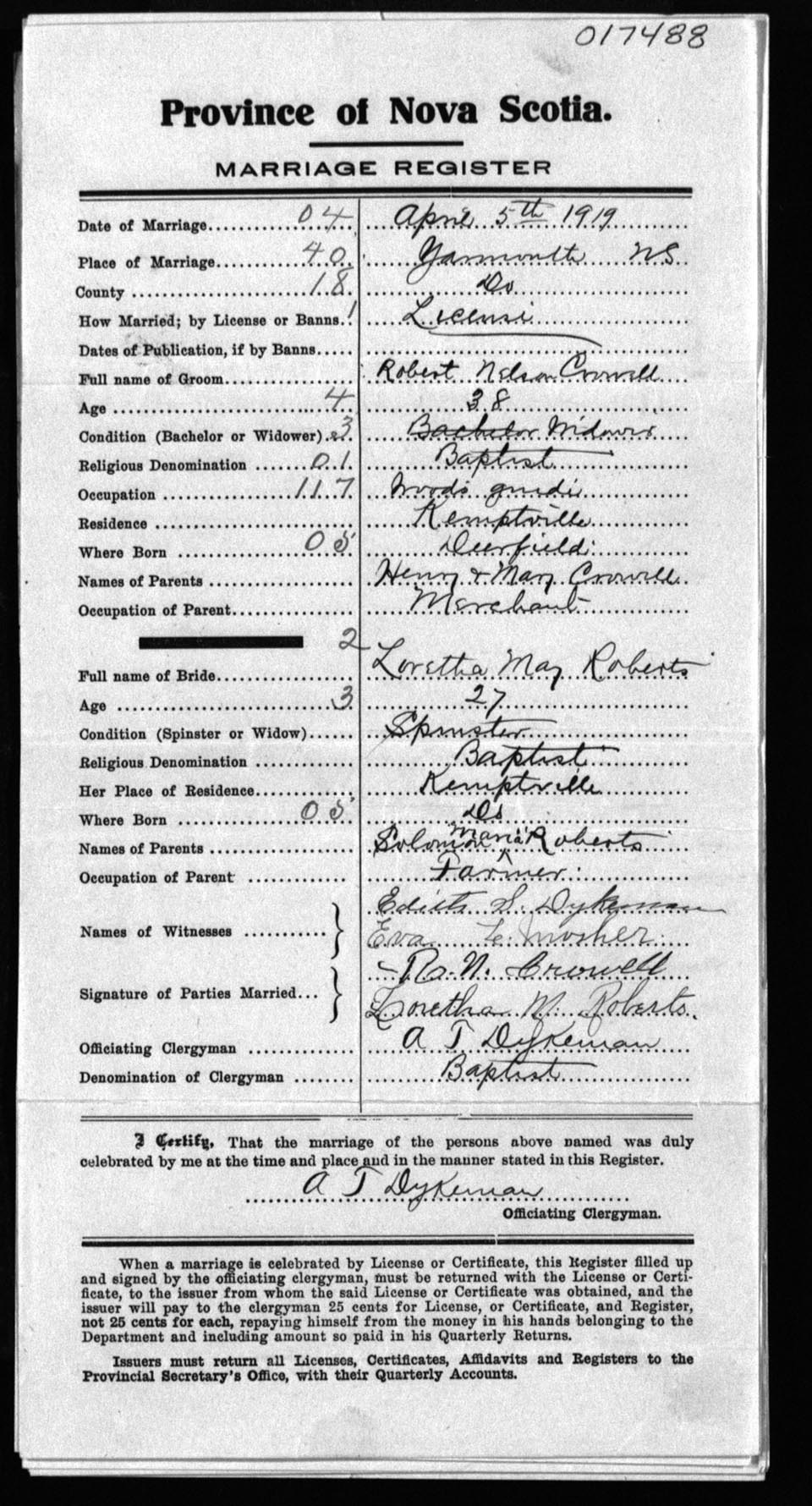 Registration: Year: 1919 number: 17488