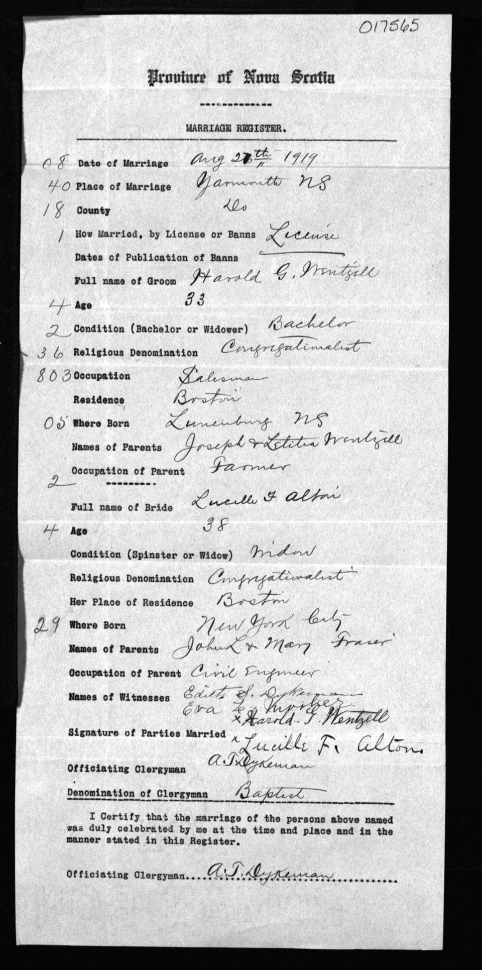 Registration: Year: 1919 number: 17565