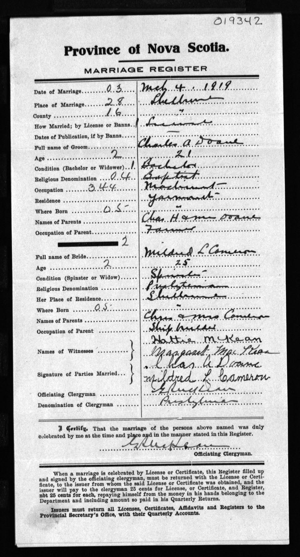 Registration: Year: 1919 number: 19342