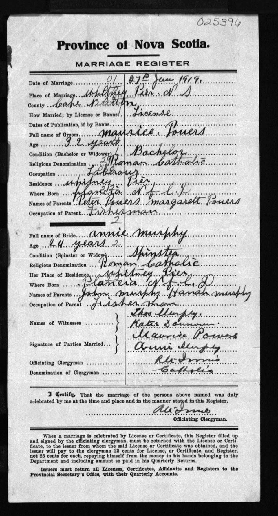 Registration: Year: 1919 number: 25396