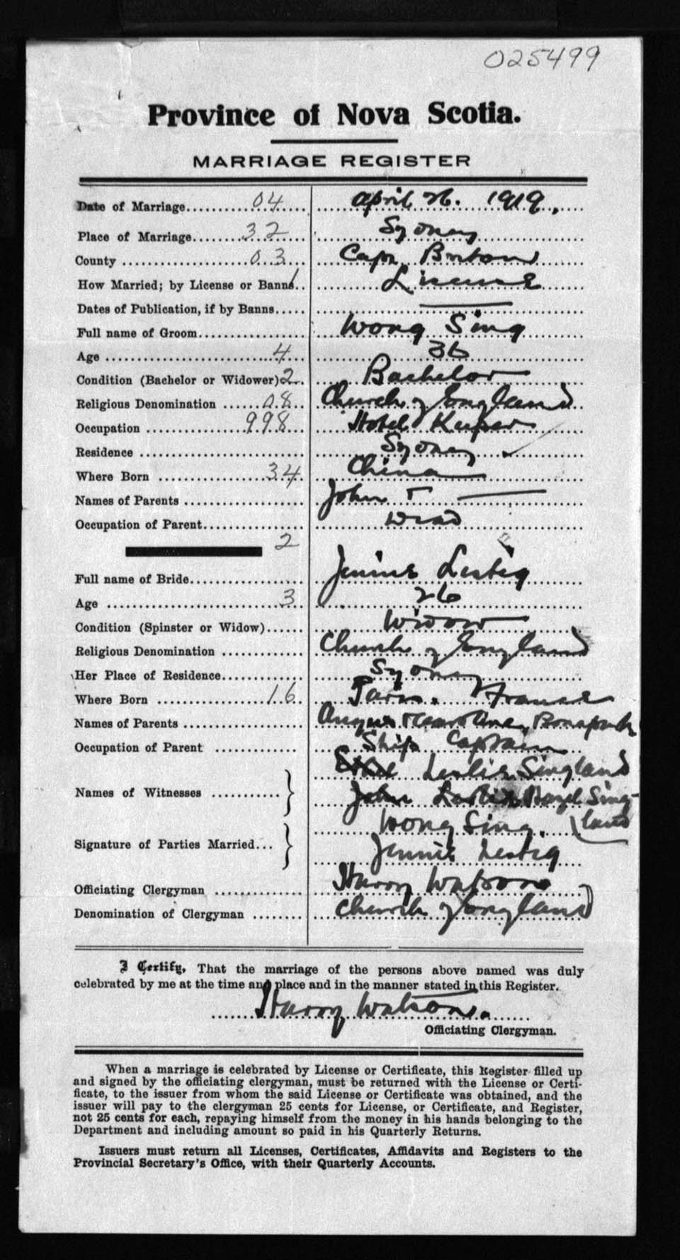 Registration: Year: 1919 number: 25499