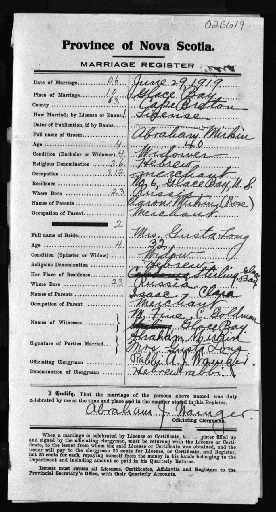 Registration: Year: 1919 number: 25619