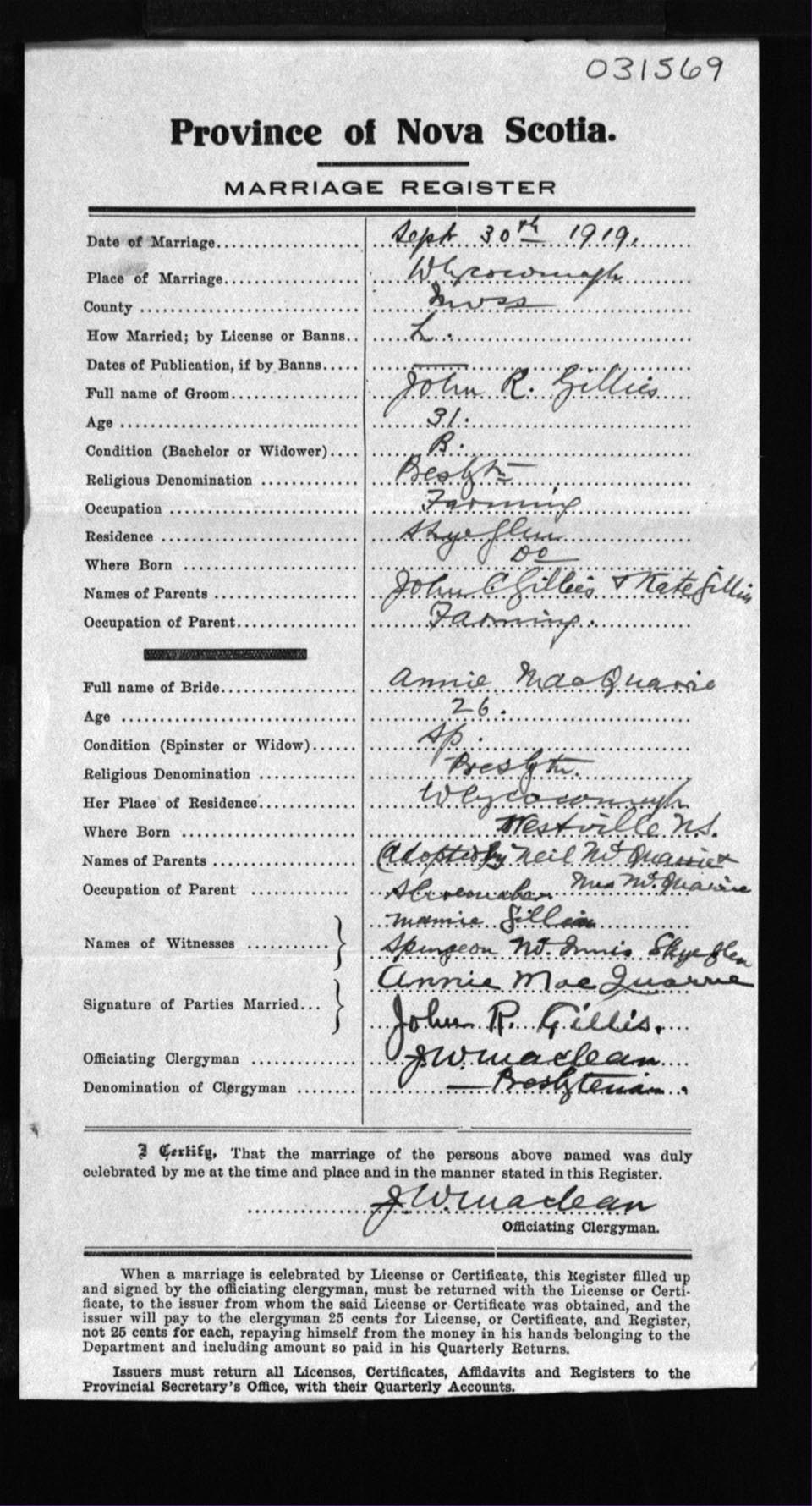 Registration: Year: 1919 number: 31569