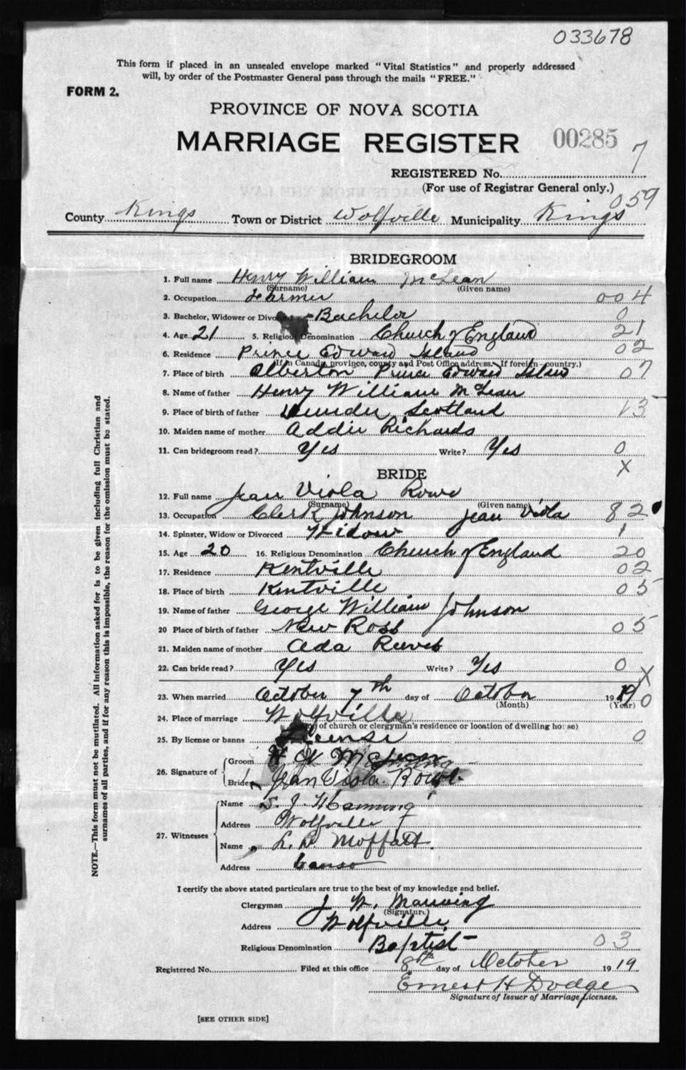 Registration: Year: 1919 number: 33678