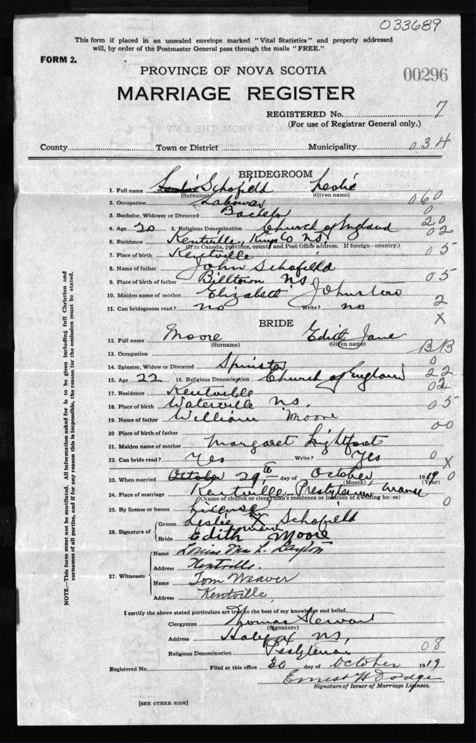 Registration: Year: 1919 number: 33689