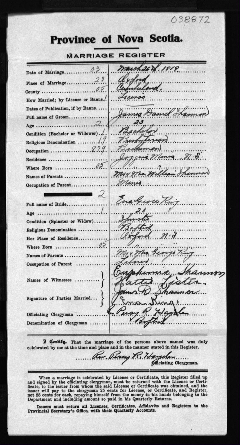 Registration: Year: 1919 number: 38872
