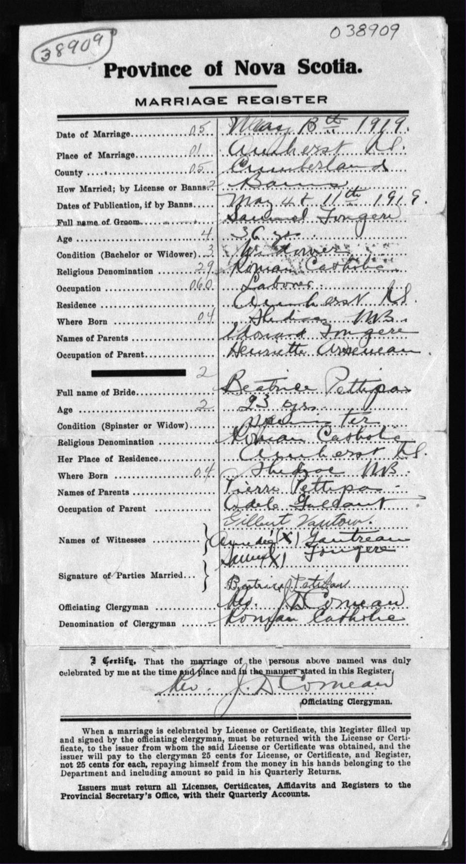 Registration: Year: 1919 number: 38909