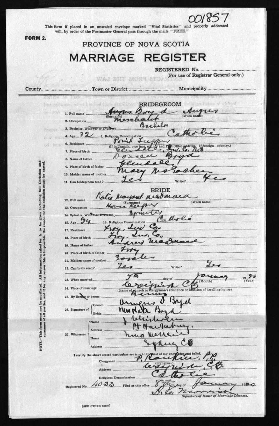 Registration: Year: 1920 number: 1857