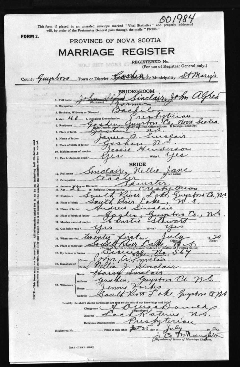 Registration: Year: 1920 number: 1984