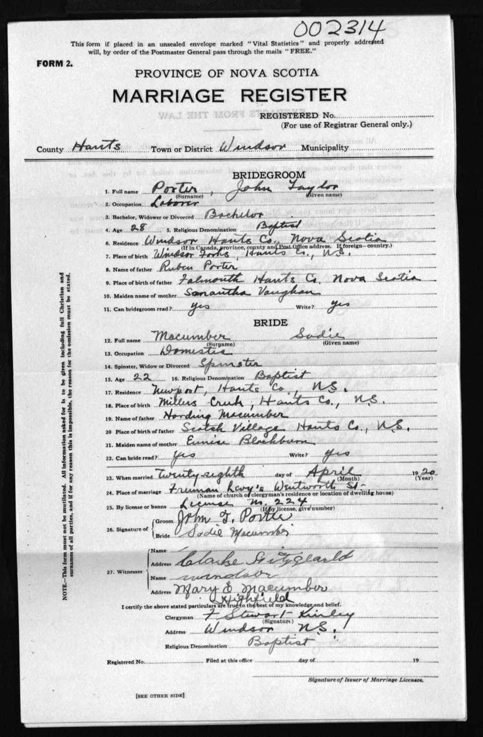 Registration: Year: 1920 number: 2314