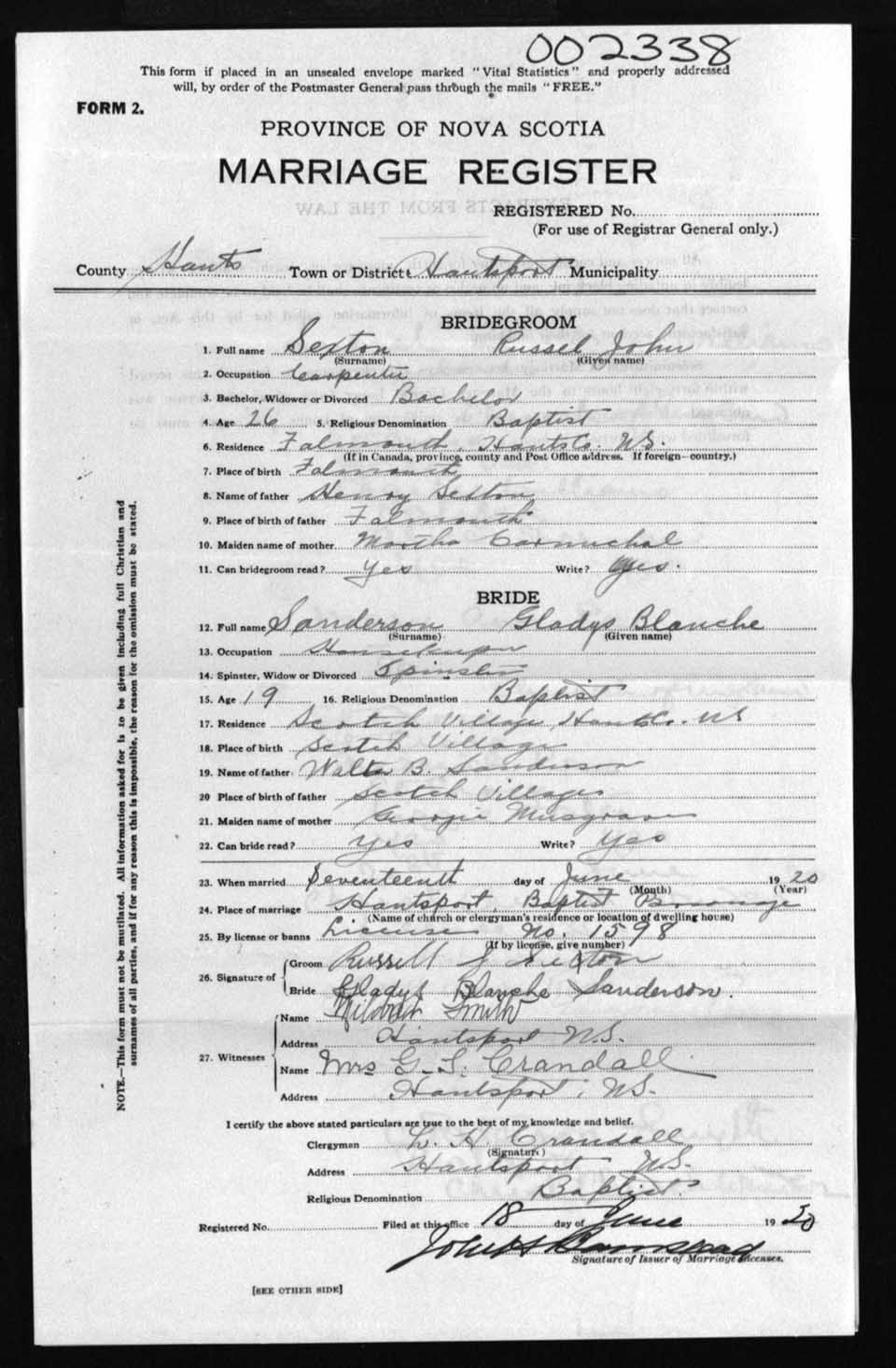 Registration: Year: 1920 number: 2338