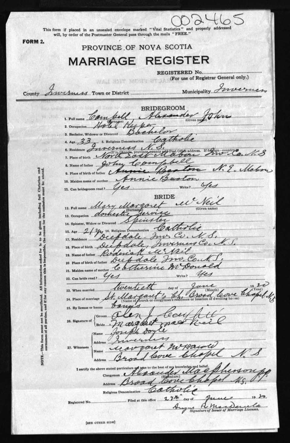 Registration: Year: 1920 number: 2465