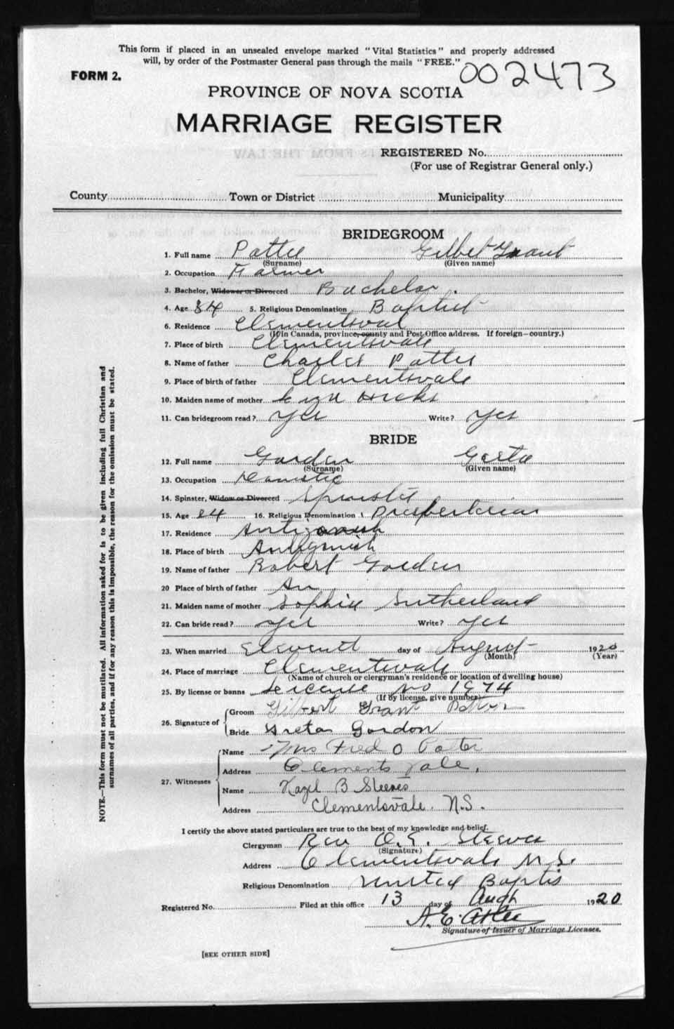 Registration: Year: 1920 number: 2473