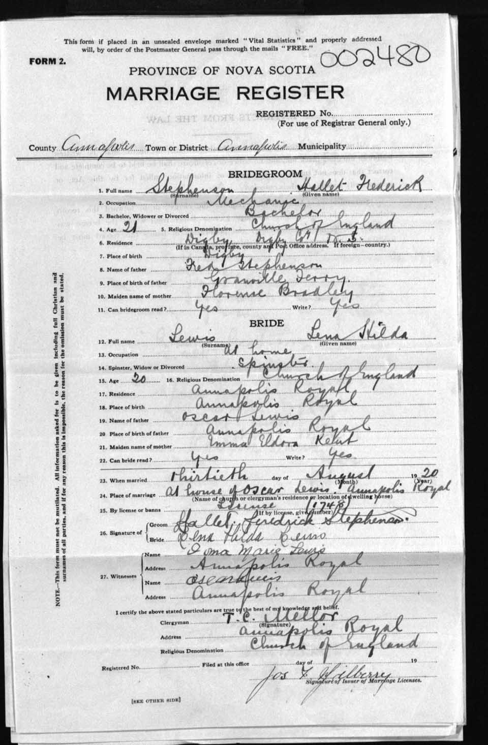 Registration: Year: 1920 number: 2480