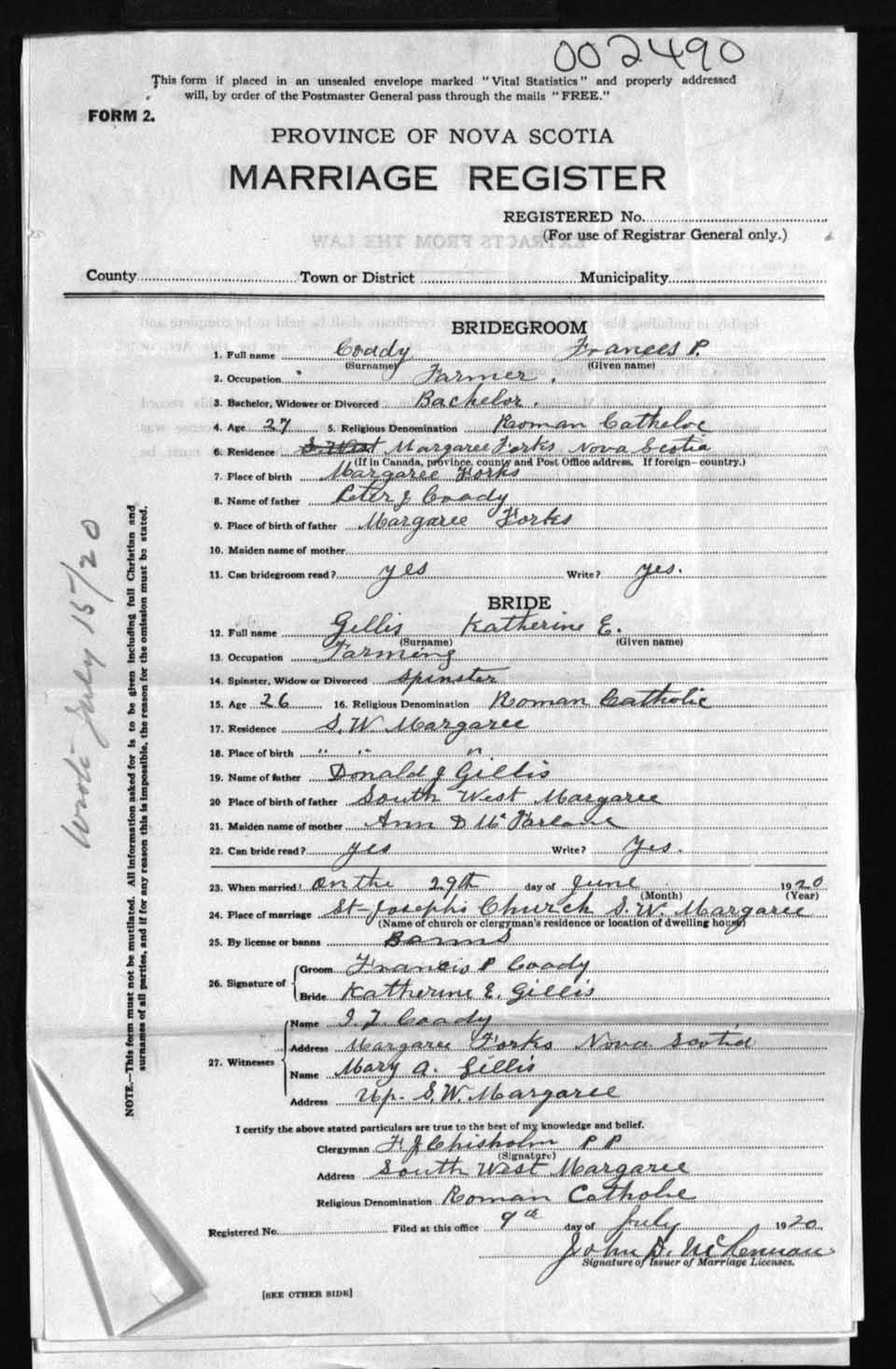 Registration: Year: 1920 number: 2490