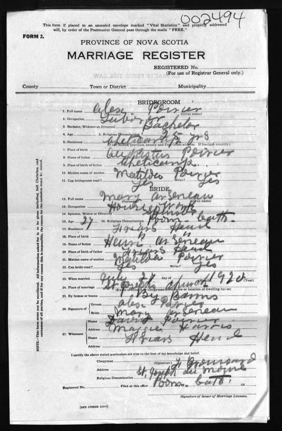 Registration: Year: 1920 number: 2494