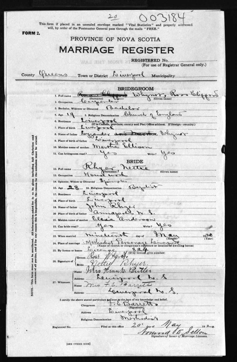 Registration: Year: 1920 number: 3184
