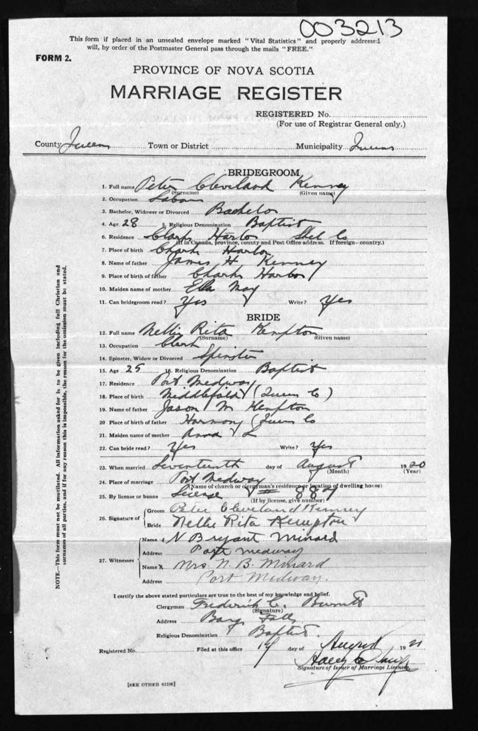 Registration: Year: 1920 number: 3213