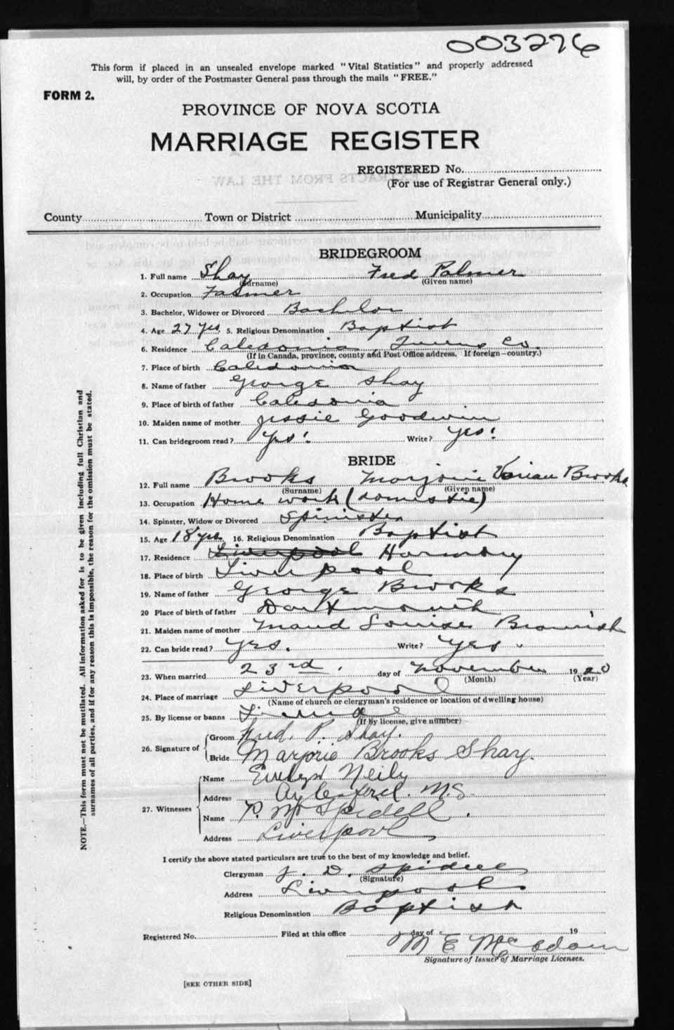 Registration: Year: 1920 number: 3276