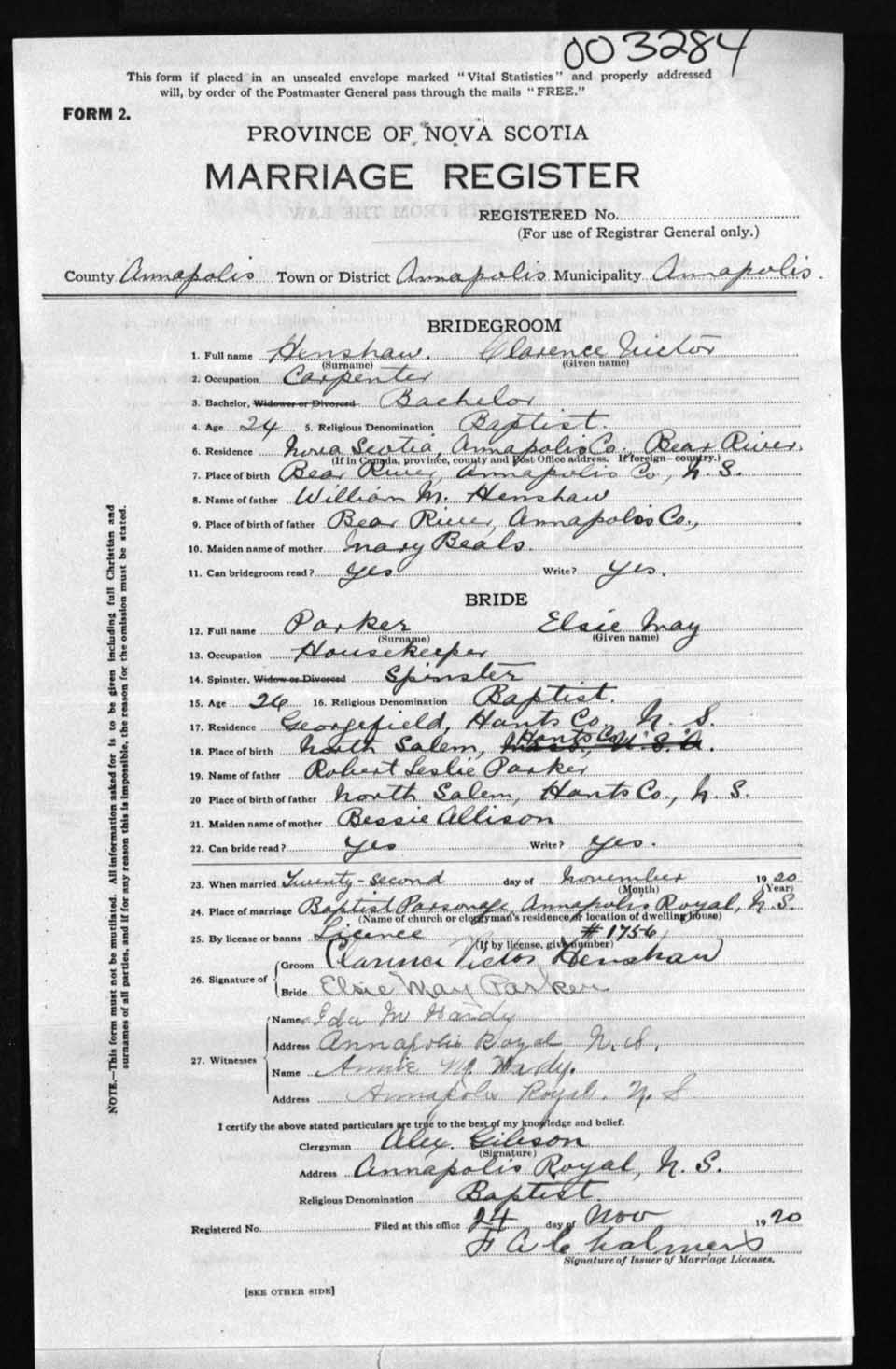 Registration: Year: 1920 number: 3284