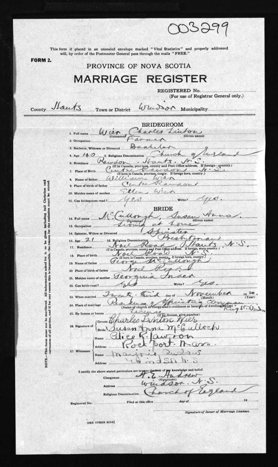 Registration: Year: 1920 number: 3299