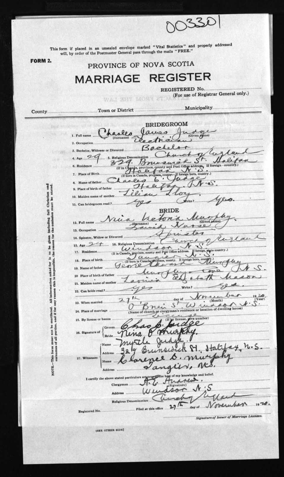 Registration: Year: 1920 number: 3301