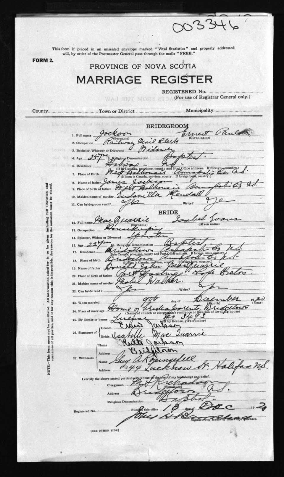 Registration: Year: 1920 number: 3346
