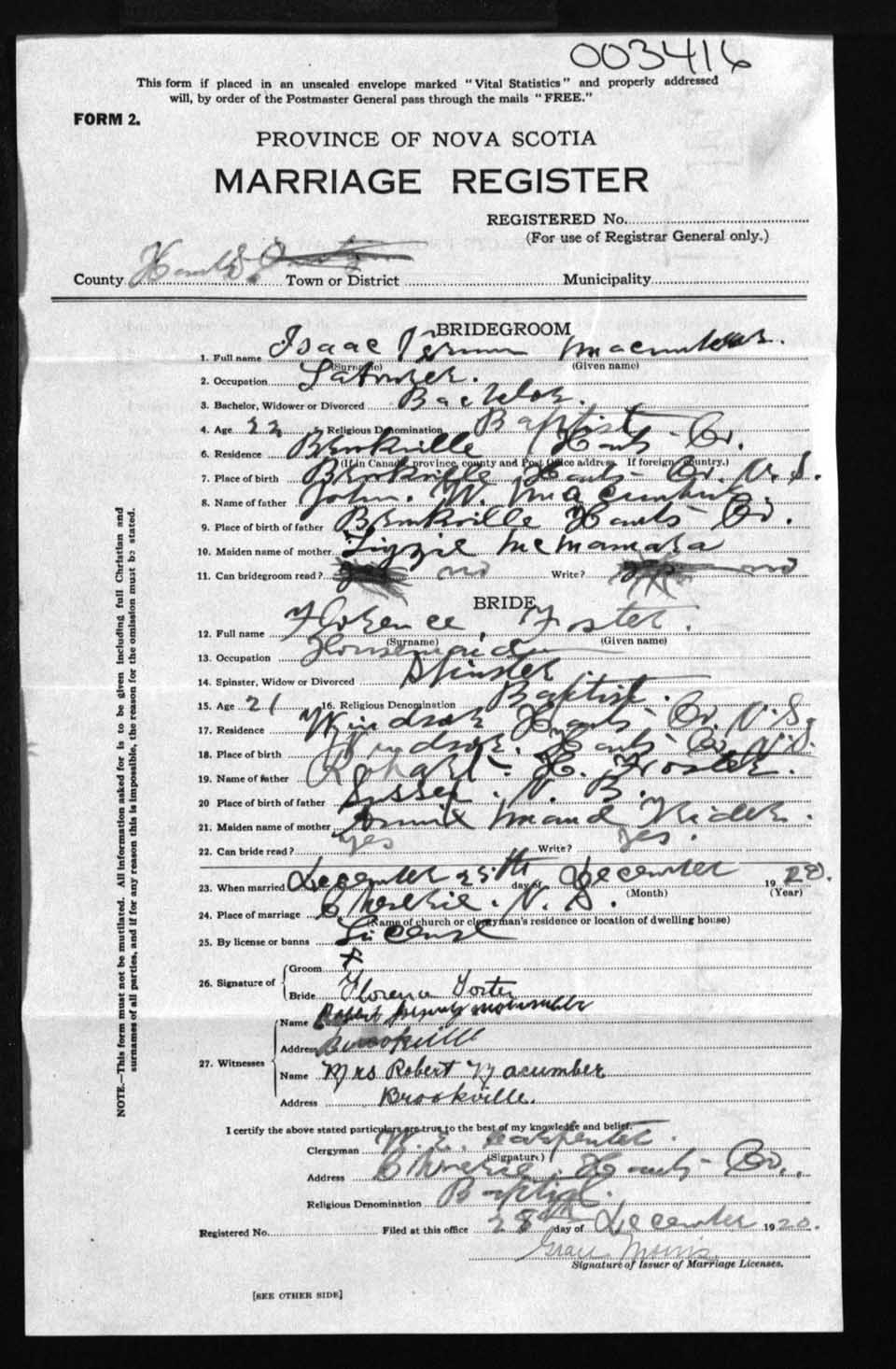Registration: Year: 1920 number: 3416