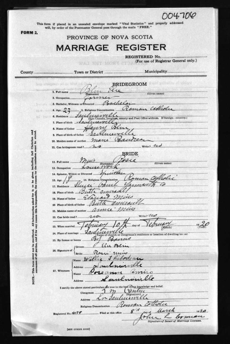 Registration: Year: 1920 number: 4706