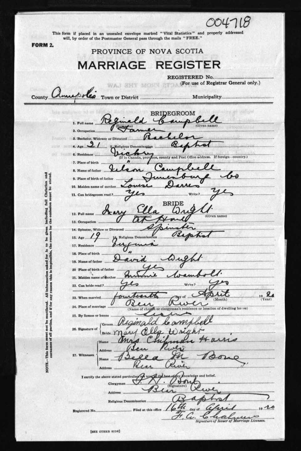 Registration: Year: 1920 number: 4718