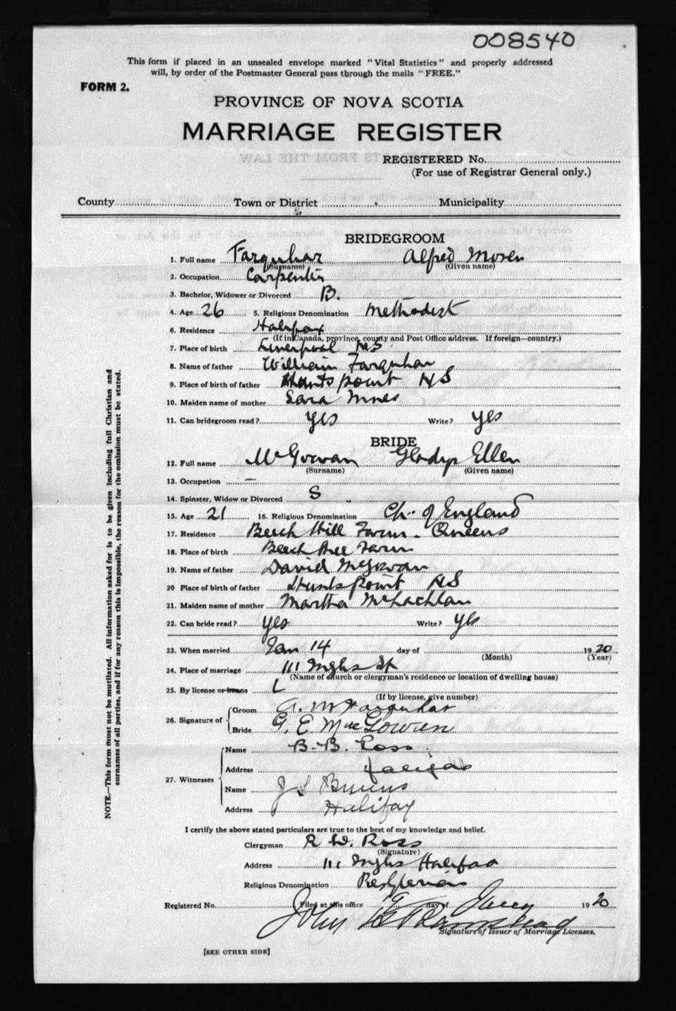 Registration: Year: 1920 number: 8540