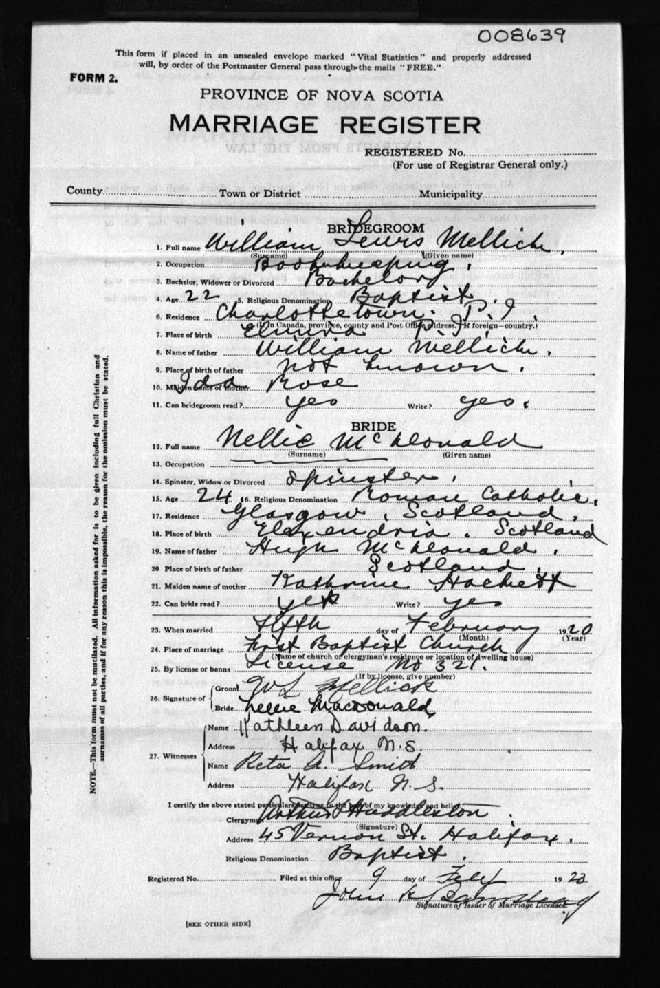 Registration: Year: 1920 number: 8639