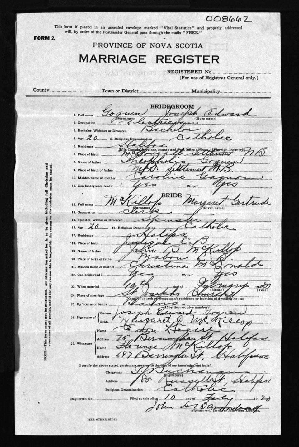 Registration: Year: 1920 number: 8662