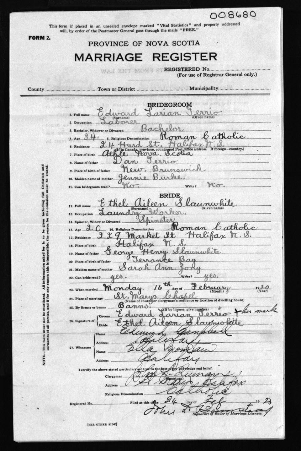Registration: Year: 1920 number: 8680