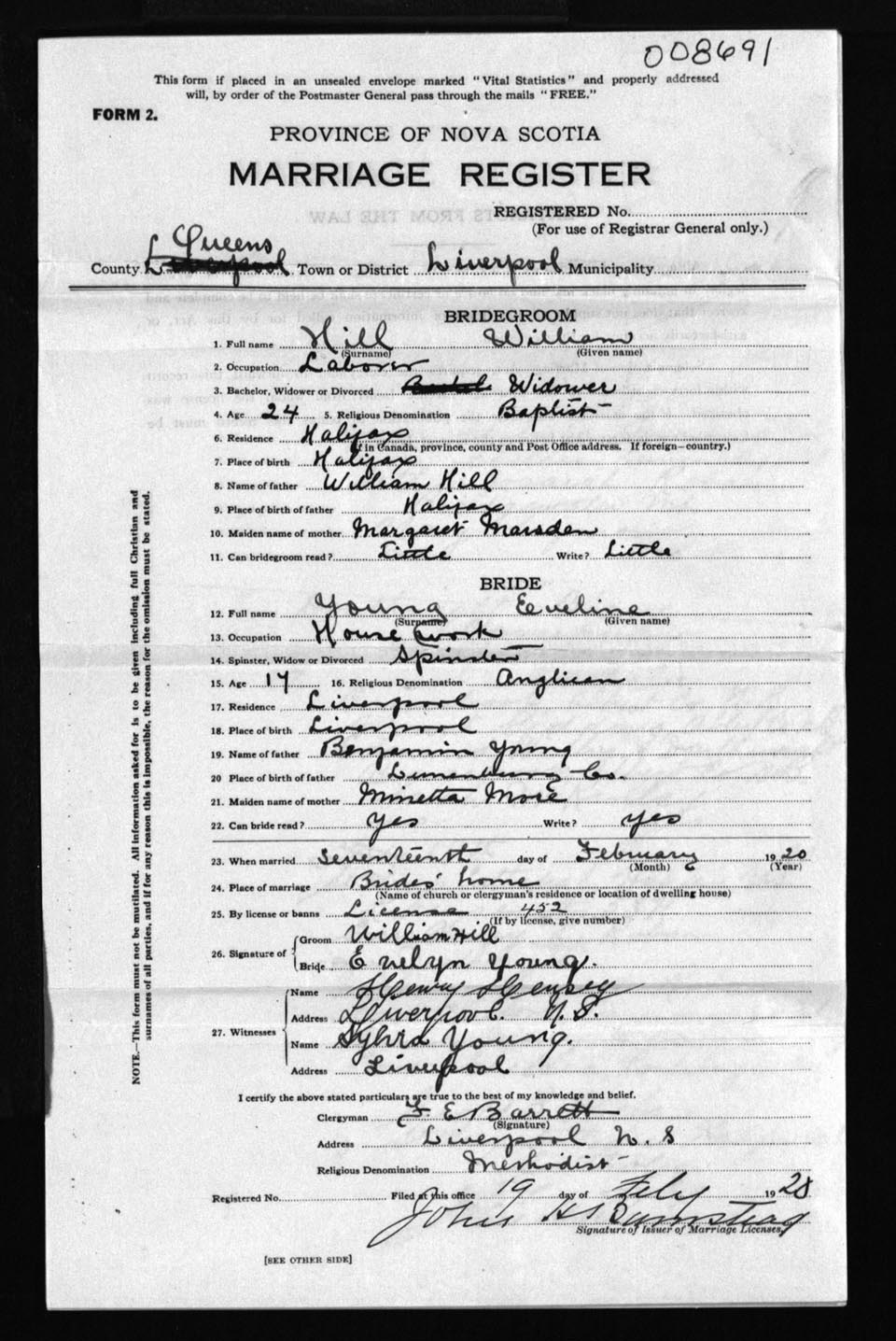 Registration: Year: 1920 number: 8691