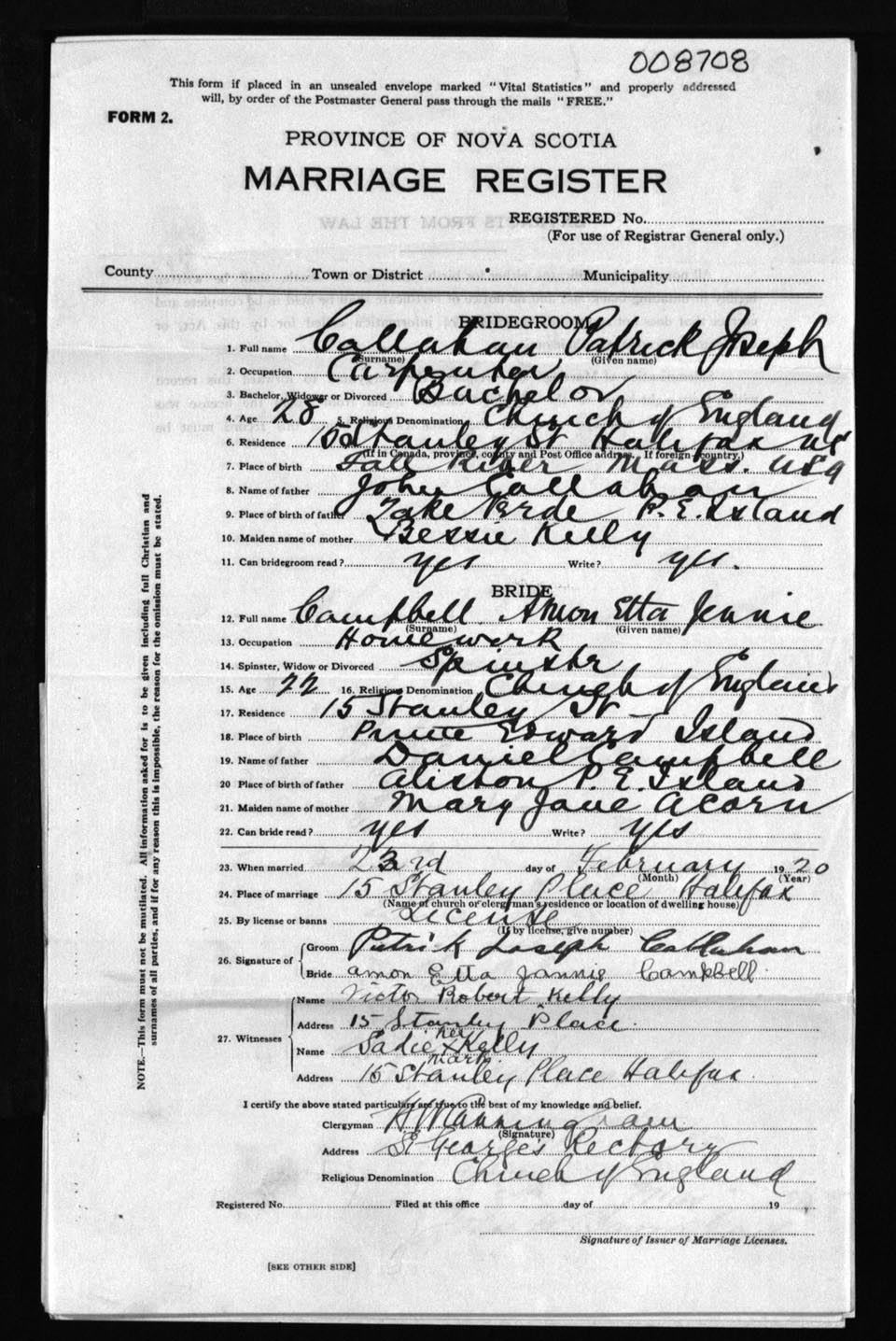 Registration: Year: 1920 number: 8708