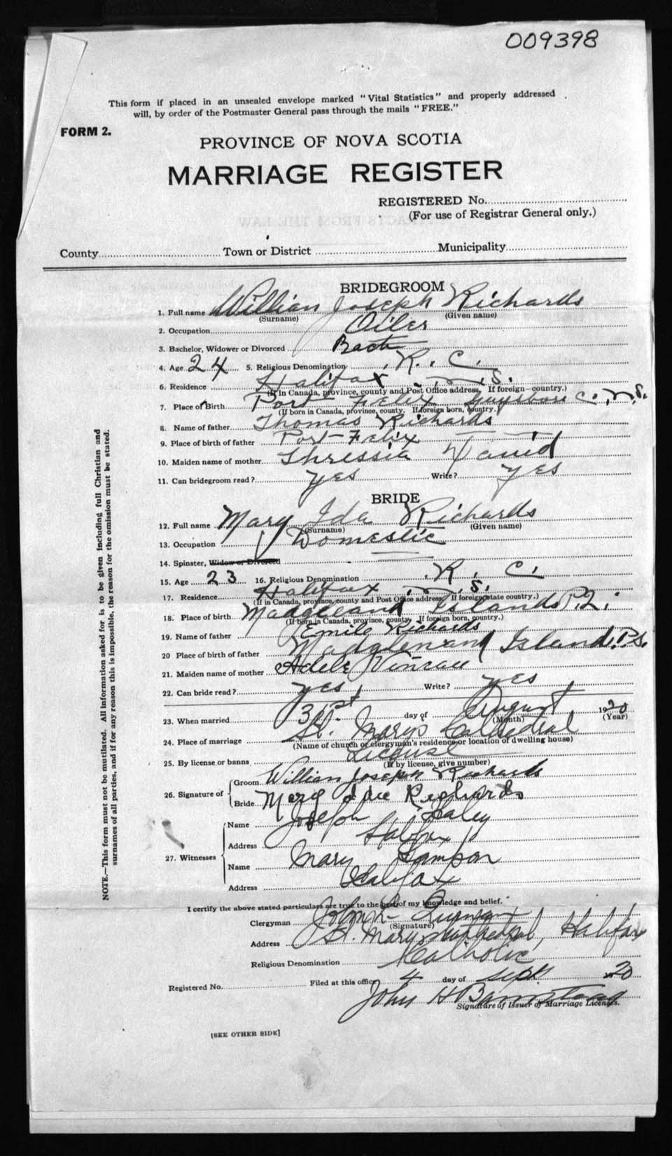 Registration: Year: 1920 number: 9398