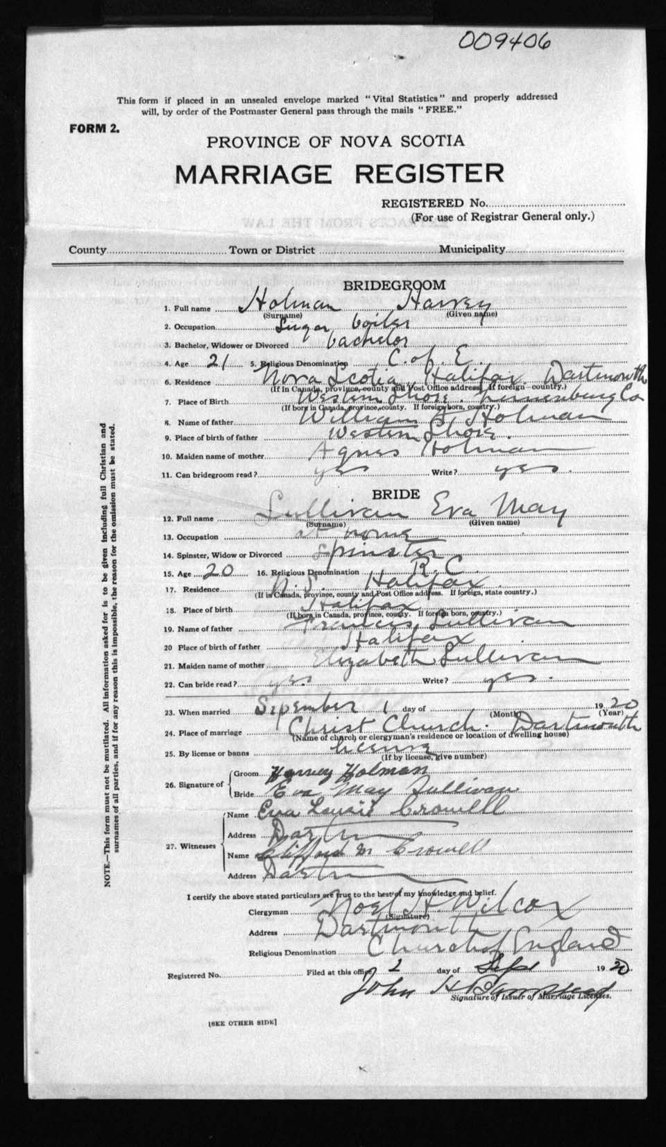 Registration: Year: 1920 number: 9406