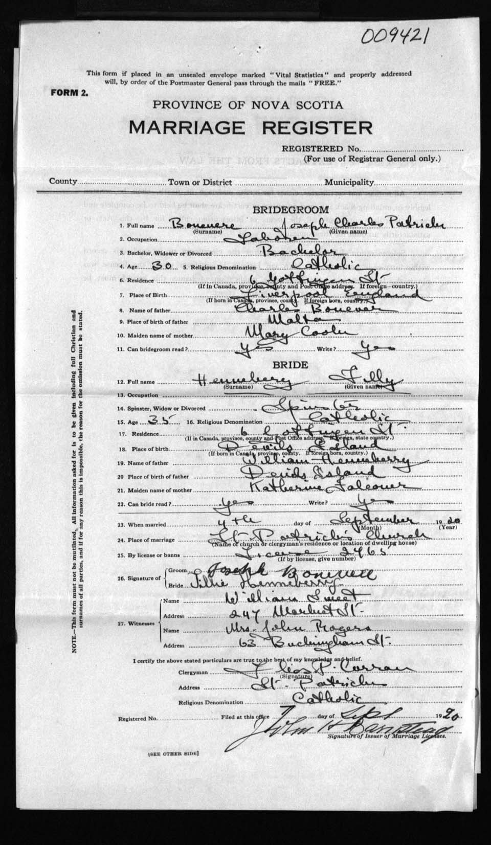 Registration: Year: 1920 number: 9421