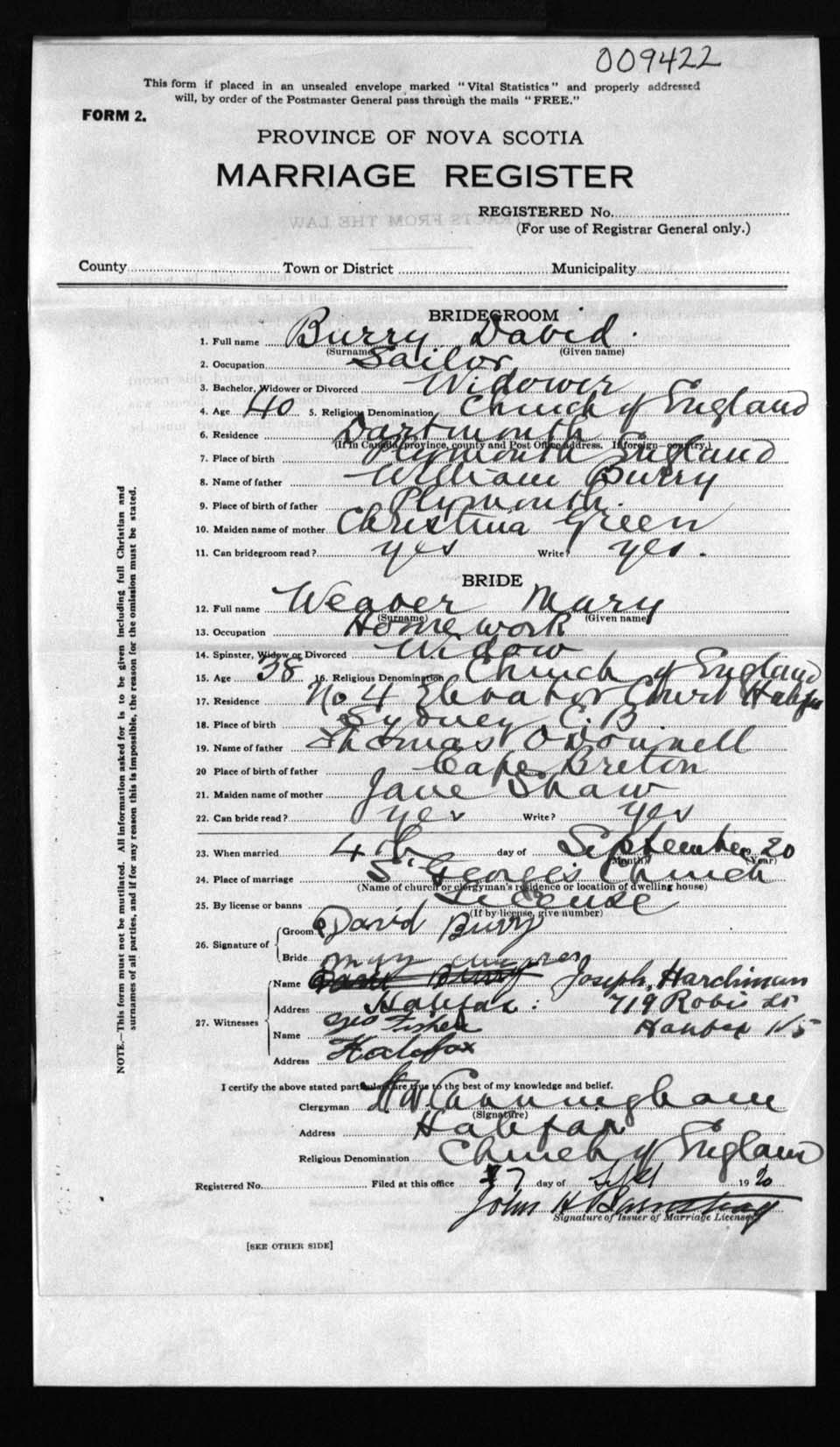 Registration: Year: 1920 number: 9422
