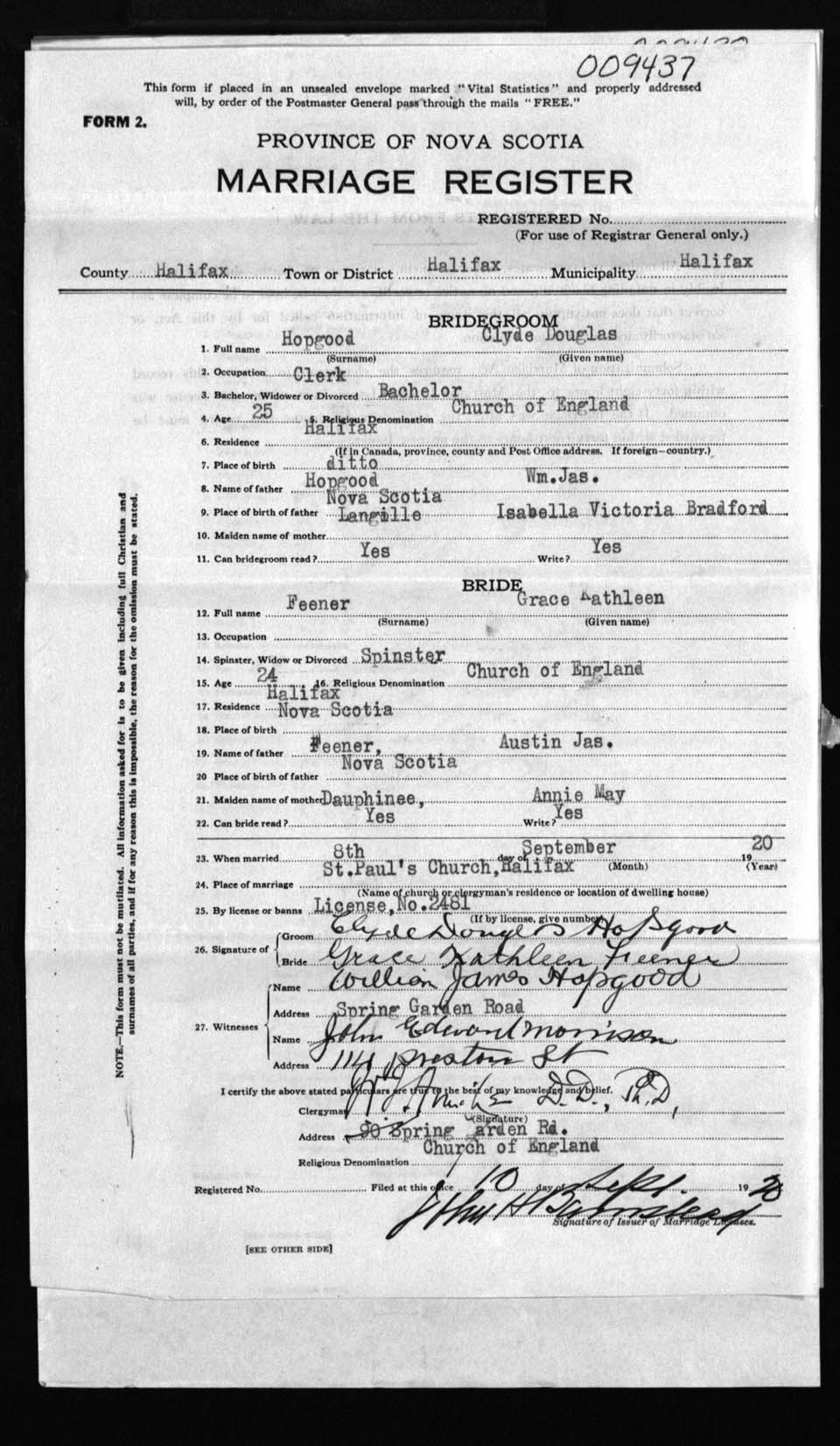Registration: Year: 1920 number: 9437