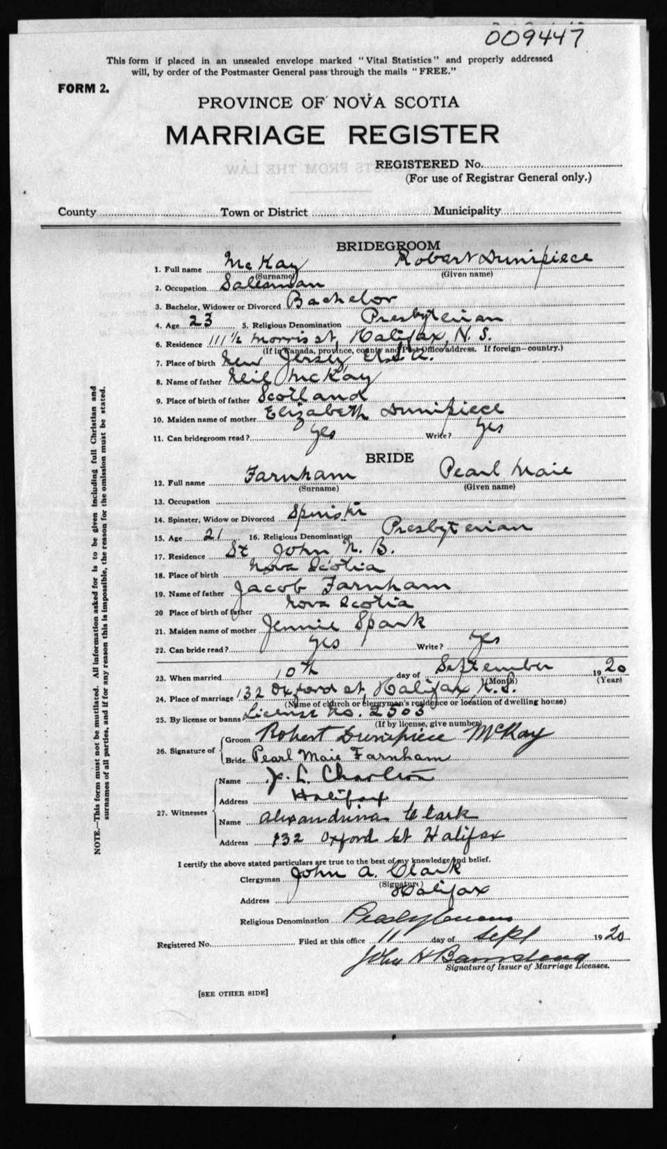 Registration: Year: 1920 number: 9447