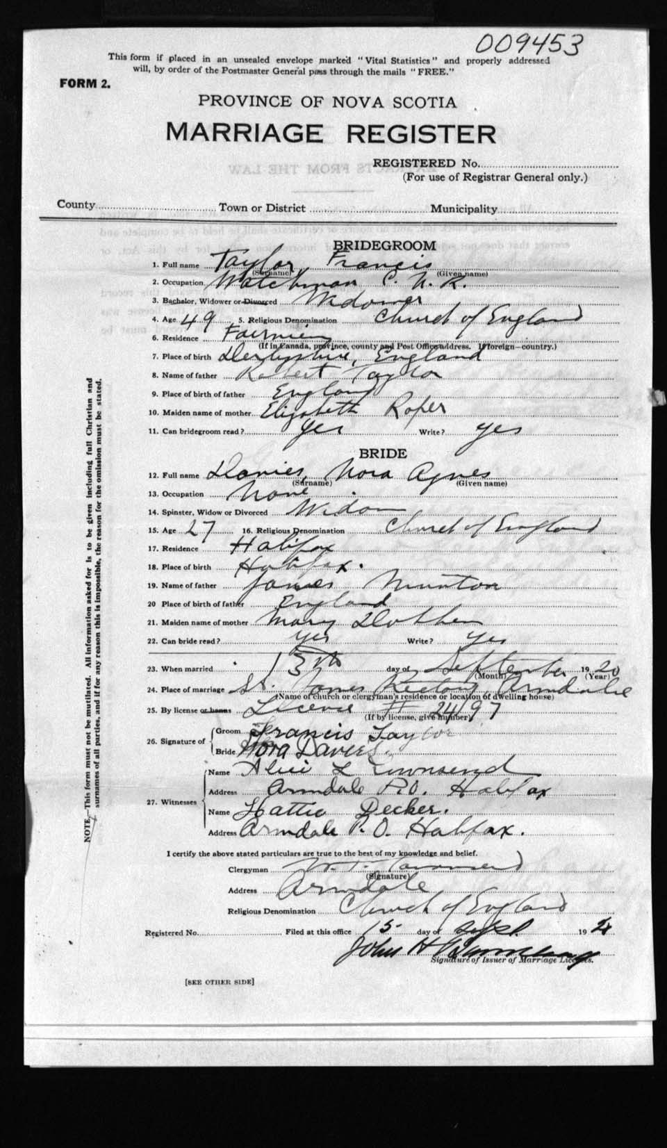 Registration: Year: 1920 number: 9453