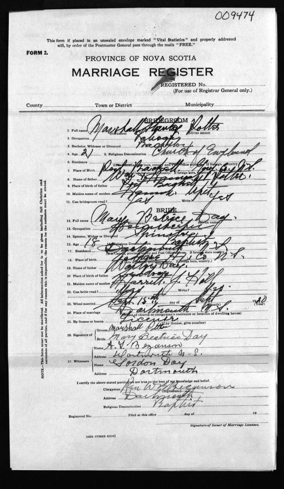 Registration: Year: 1920 number: 9474