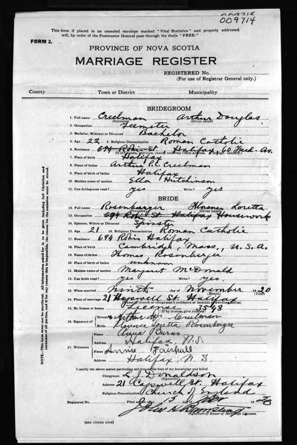 Registration: Year: 1920 number: 9714