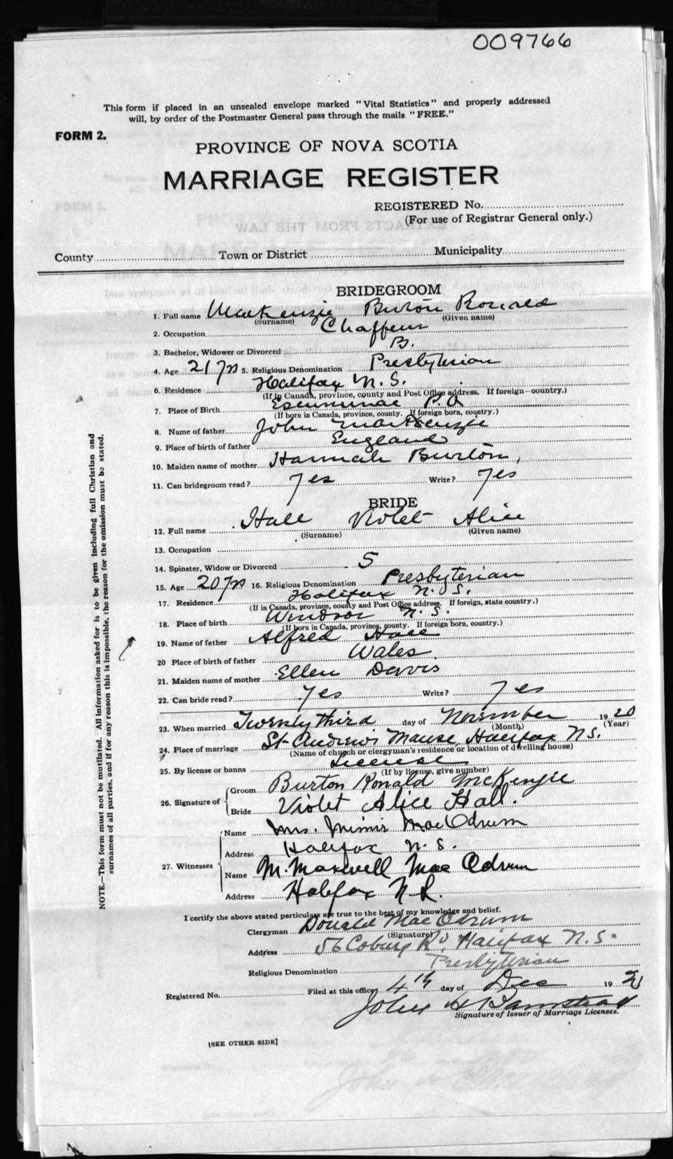 Registration: Year: 1920 number: 9766