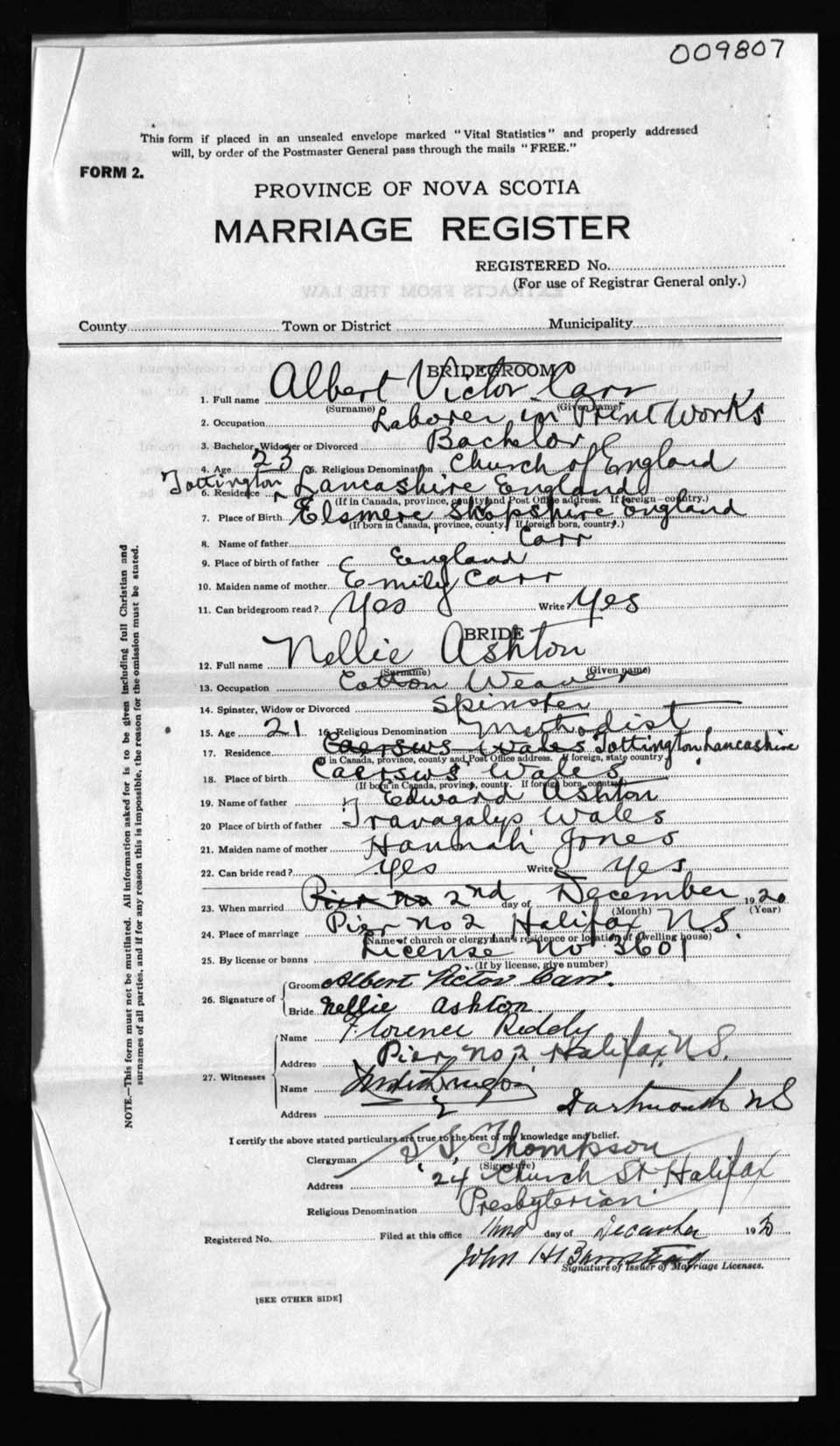 Registration: Year: 1920 number: 9807