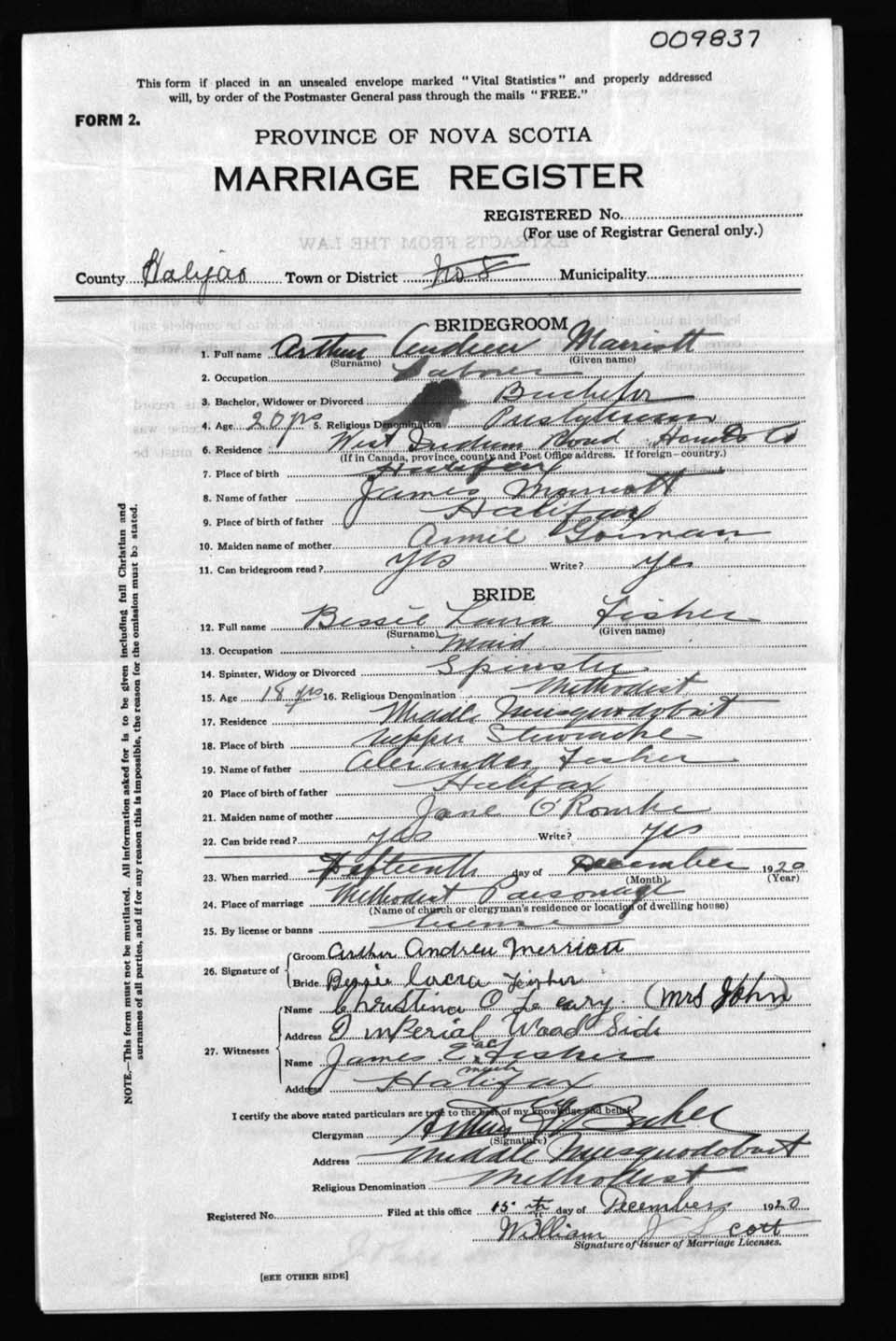 Registration: Year: 1920 number: 9837