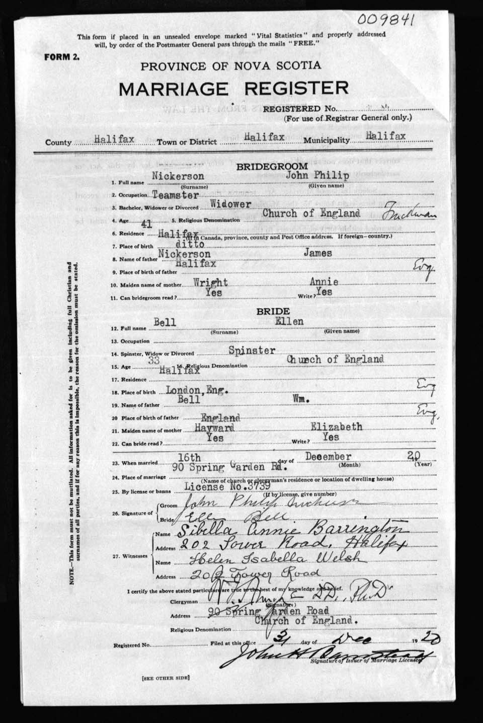 Registration: Year: 1920 number: 9841